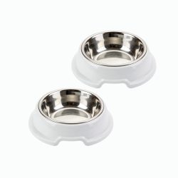 • A set of two stainless steel pet food bowls, suitable for puppies, adult dogs, cats, or kittens.