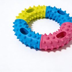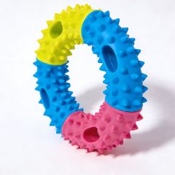 **Multi-Colored Design:** The toy features a segmented design in blue, yellow, and pink, with a surface covered in dense raised dots. The vibrant and bright colors create a strong visual impact, quickly attracting the dog’s attention.